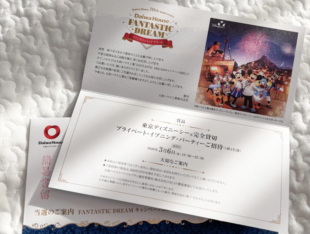 今回のダイワハウスの貸切はシーで、2026年3月6日(金)19:30〜22:30の完全貸切でした。(当日は18:00でパークが一旦閉園し、一般のゲストは退場します。19:30から貸切チケットを持った人だけが入場できます。)12月下旬に当選のお知らせが届き、後日改めて紙チケットやパークマップが届きました!イベントアンケートへの回答でリゾート内で使える500円券も貰いました!