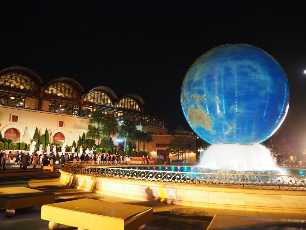 ホテルからリゾートラインに乗って、19:30過ぎにメインゲートの入場列に並びました。手荷物検査などをして10分くらいで入場。さすが貸切だけあって、そんなに待つこともなく入れました。地球儀のところで早速キャラクター達がショーをしていたり、企業のお偉いさん?達のハイタッチなどいつものパークとは違った雰囲気!