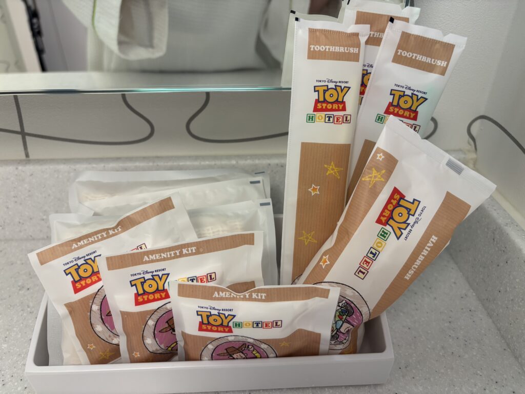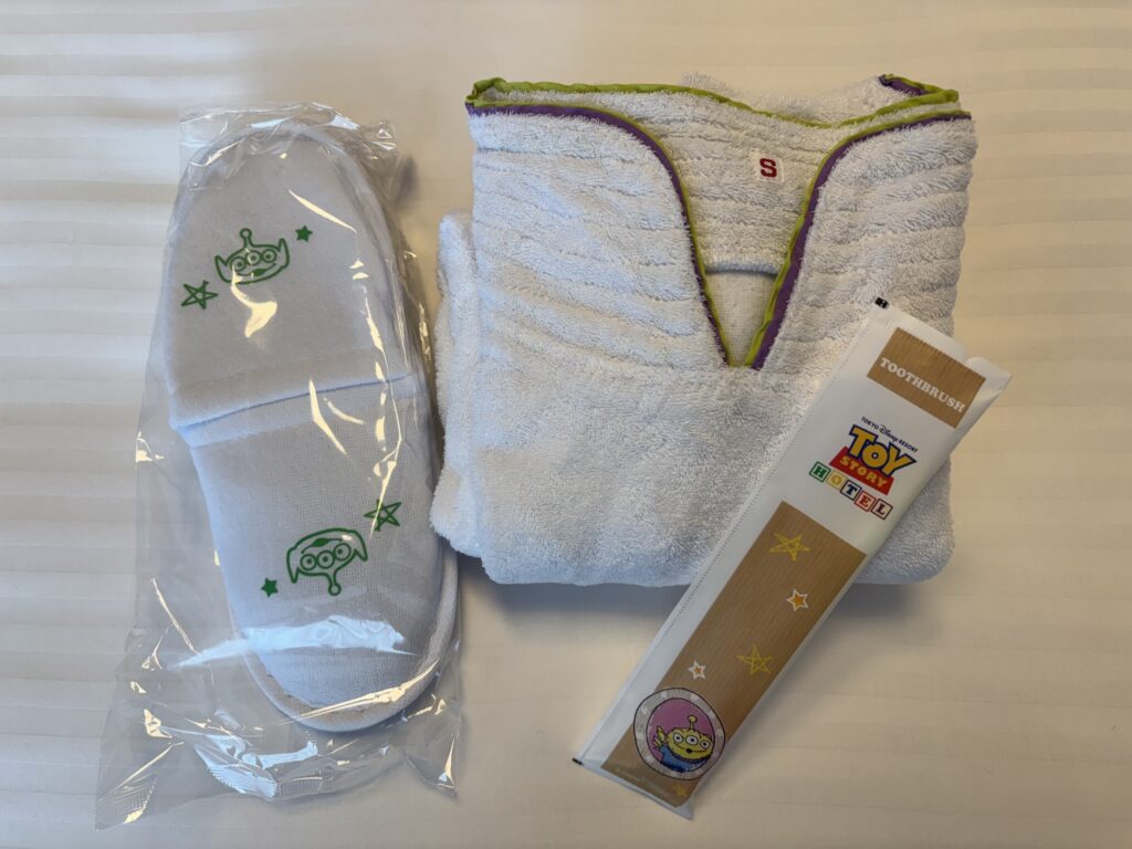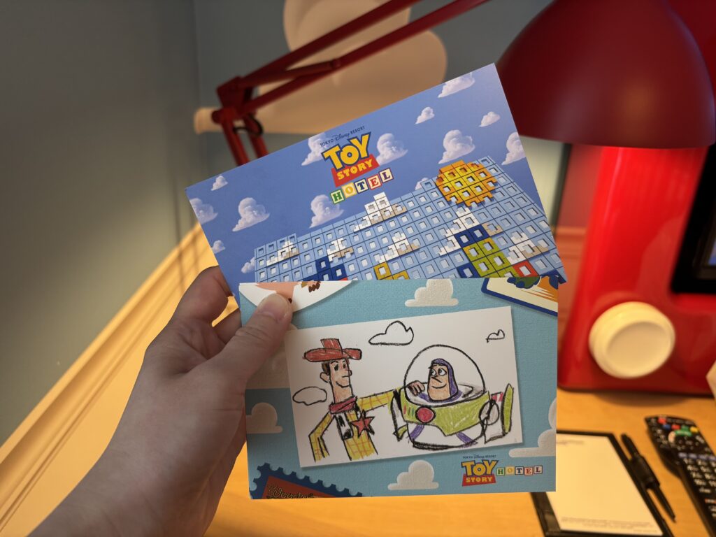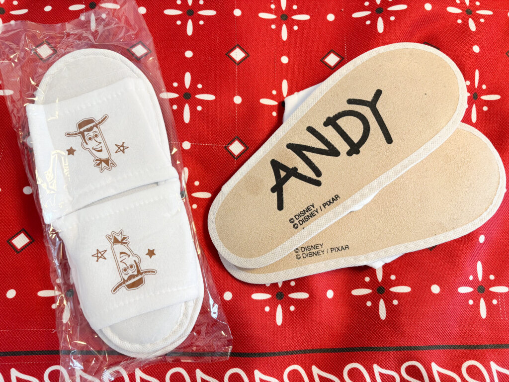アメニティ類の中でもANDYと書かれたスリッパ、バズのパジャマがこのホテルならでは!ポストカードもお部屋に貼ってある絵と同じものです。