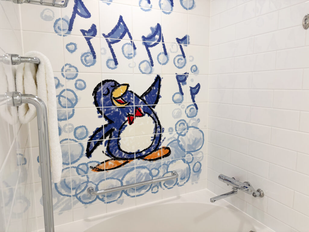 お風呂にはウィージーがいました!洗い場と浴槽が別々で広いので子連れでも使いやすいです。