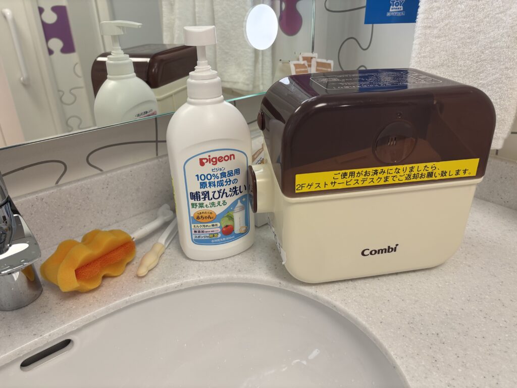 このときにフロントで洗顔・化粧水・乳液のアメニティをもらって、ゲストサービスで赤ちゃんの哺乳瓶洗浄セットを借りました。
