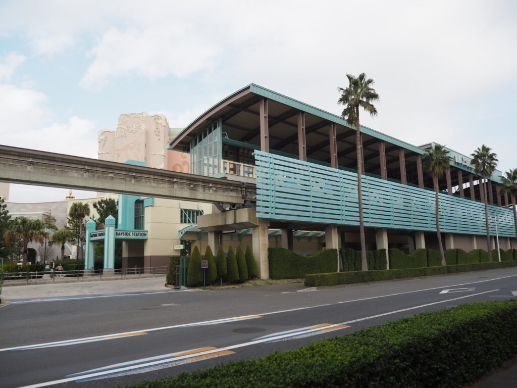ホテルはディズニーリゾートラインのベイサイドステーションの目の前にあります。舞浜駅やパークからのシャトルバスは無いので、公共交通機関で行く場合はリゾートラインを使うことになります。私たちは羽田空港からリムジンバスに乗ったので、そのままホテルまで。パークに行く際はリゾートラインを利用しました。